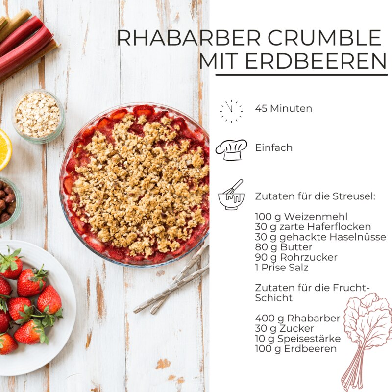 Es ist Zeit für Rhabarber. Ihr seid schon begeisterte Fans oder wollt es noch werden, dann probiert doch mal dieses Rezept aus! Unser Rhabarber-Auflauf mit Erdbeeren und leckeren Streuseln wird sicherlich nicht nur euch, sondern die ganze Familie begeistern. Ihr braucht keinen besonderen Anlass, um diesen Rhabarber Crumble nachzumachen. Probiert es einfach direkt aus und überrascht eure Lieblingsmenschen mit dieser leckeren Köstlichkeit.