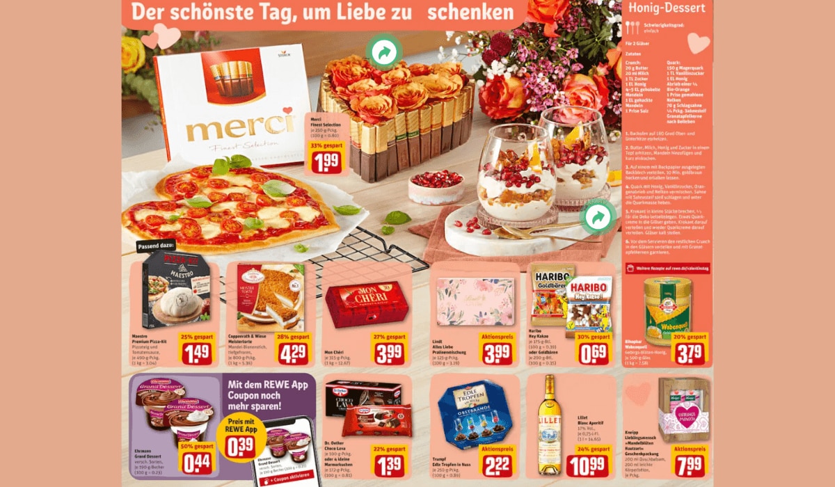 REWE möchte euch und eure Liebsten glücklich machen. Deswegen gibt es hier neben leckerster merciSchokolade für1,99 Euro, Lilletfür 10,99 Euro oder Coppenrath & Wiese Torten ab 4,29 Euro auch noch ein leckeres Rezept für ein cremiges Honig-Dessert. Unbedingt ausprobieren, denn Liebe geht ja bekanntlich durch den Magen!