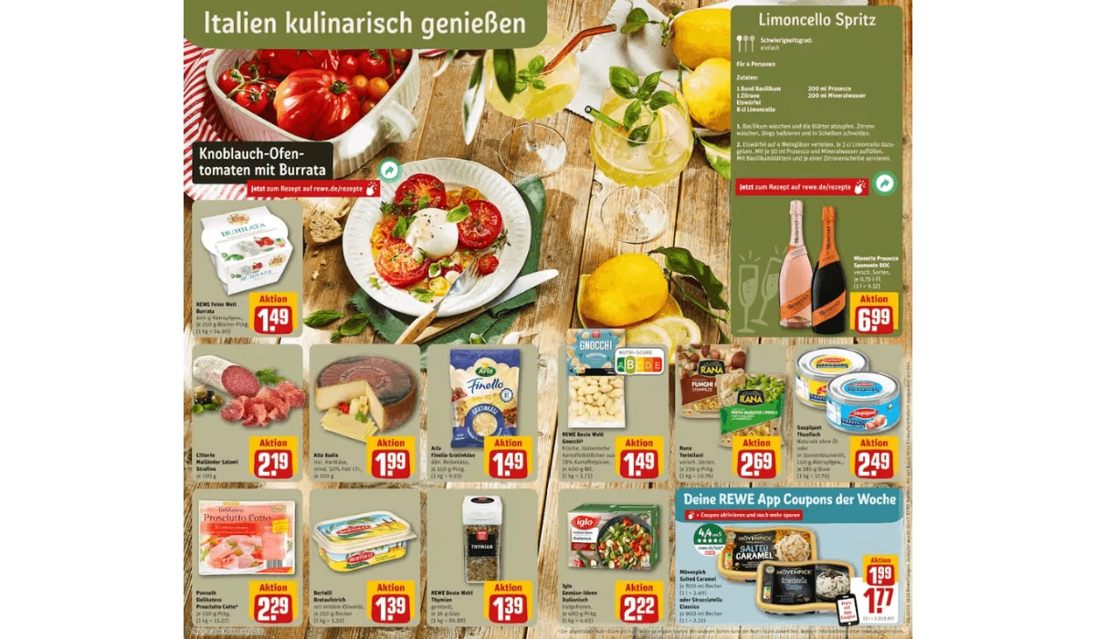 Auch REWE hat in dieser Woche kulinarische Highlights aus Italien zu bieten. Feinsten Burrata gibt es schon ab 1,49 Euro, Mailänder Salami kommt zum Aktionspreis von nur 2,19 Euro, Prosciutto gibt es schon ab 2,29 Euro und für euren Limoncello Spritz findet ihr bei REWE diese Prosecco im Angebot für nur 6,99 Euro. Stöbert euch direkt durch den aktuellen Prospekt von Rewe und entdeckt noch weitere italienische Leckerbissen zum Schnäppchenpreis.