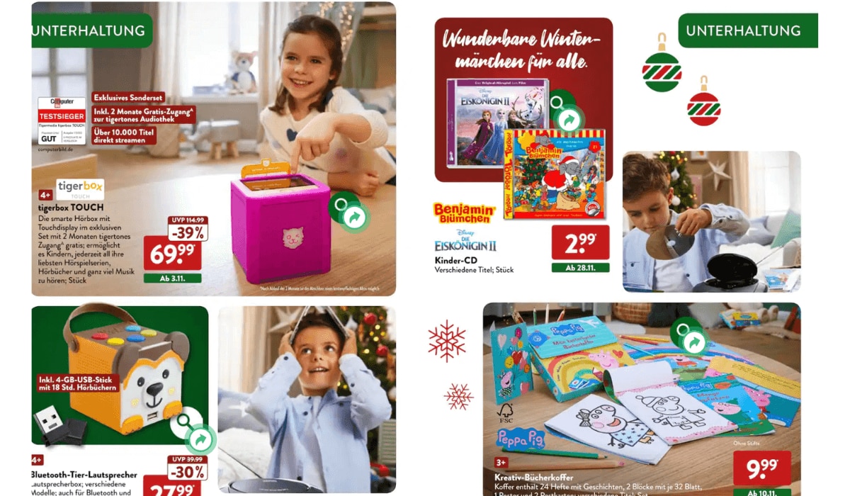 ALDI Nord hat in dieser Woche eine Sonderbeilage, die sich nur um Weihnachten dreht! Hier findet ihr neben hübscher Deko auch tolle Geschenke für die Kleinen! Märchenhafte Musikboxen für 69,99 Euro, Hörspiele ab 2,99 Euro, Malbücher, Spielsachen und vieles mehr, lassen Kinderherzen höher schlagen!